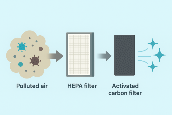 Không khí sau khi hút ẩm sẽ đi qua bộ lọc kép gồm màng HEPA và màng than hoạt tính: